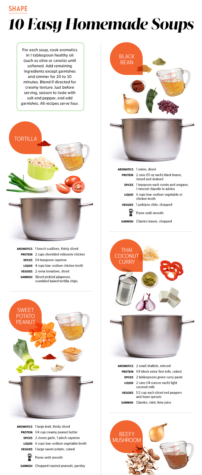 Soup recipe template with variations. See the complete graphic on shape.com: https://www.shape.com/healthy-eating/healthy-recipes/all-souped